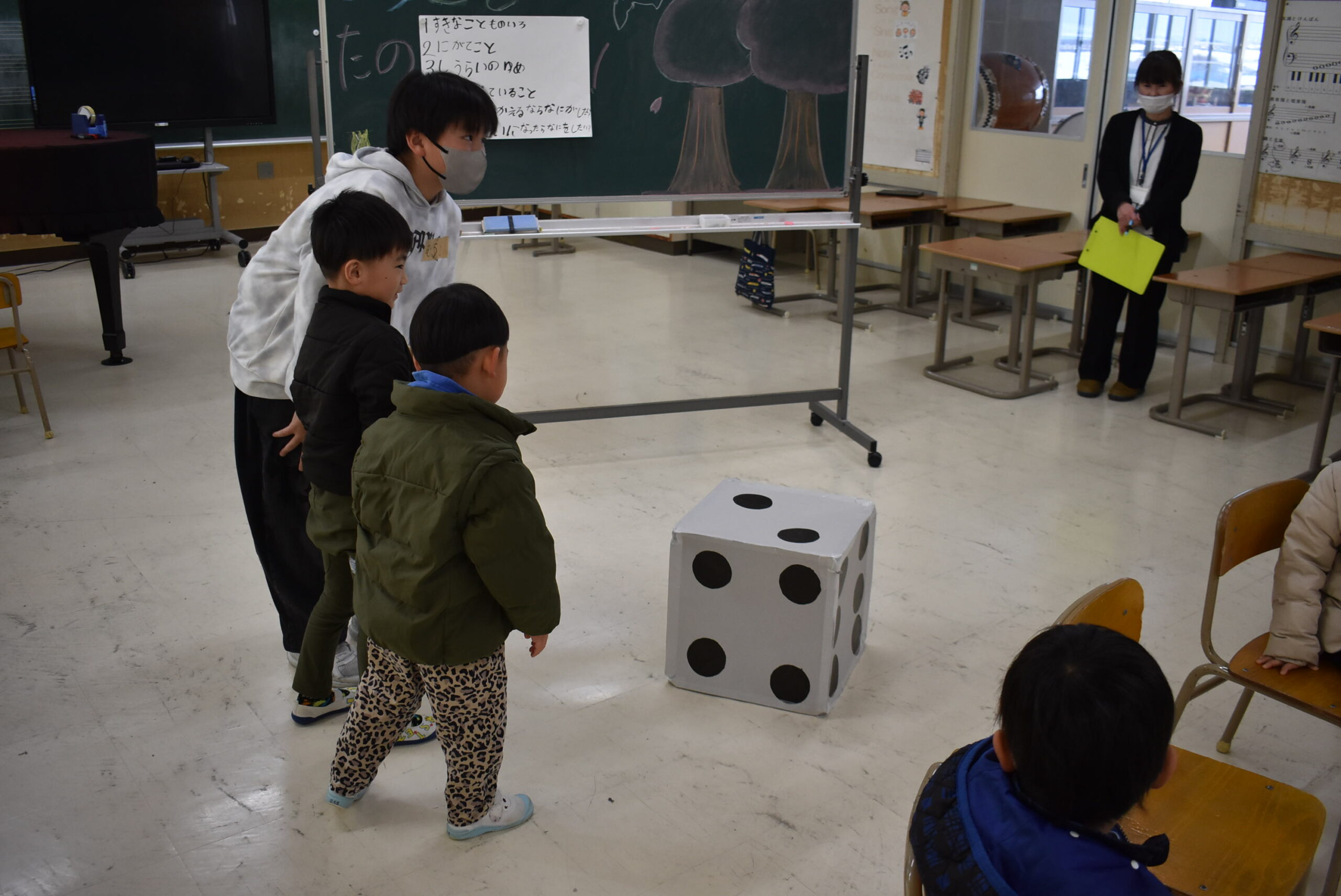 次は、大きなサイコロを振って、出た目のことを5年生に教えてあげます。