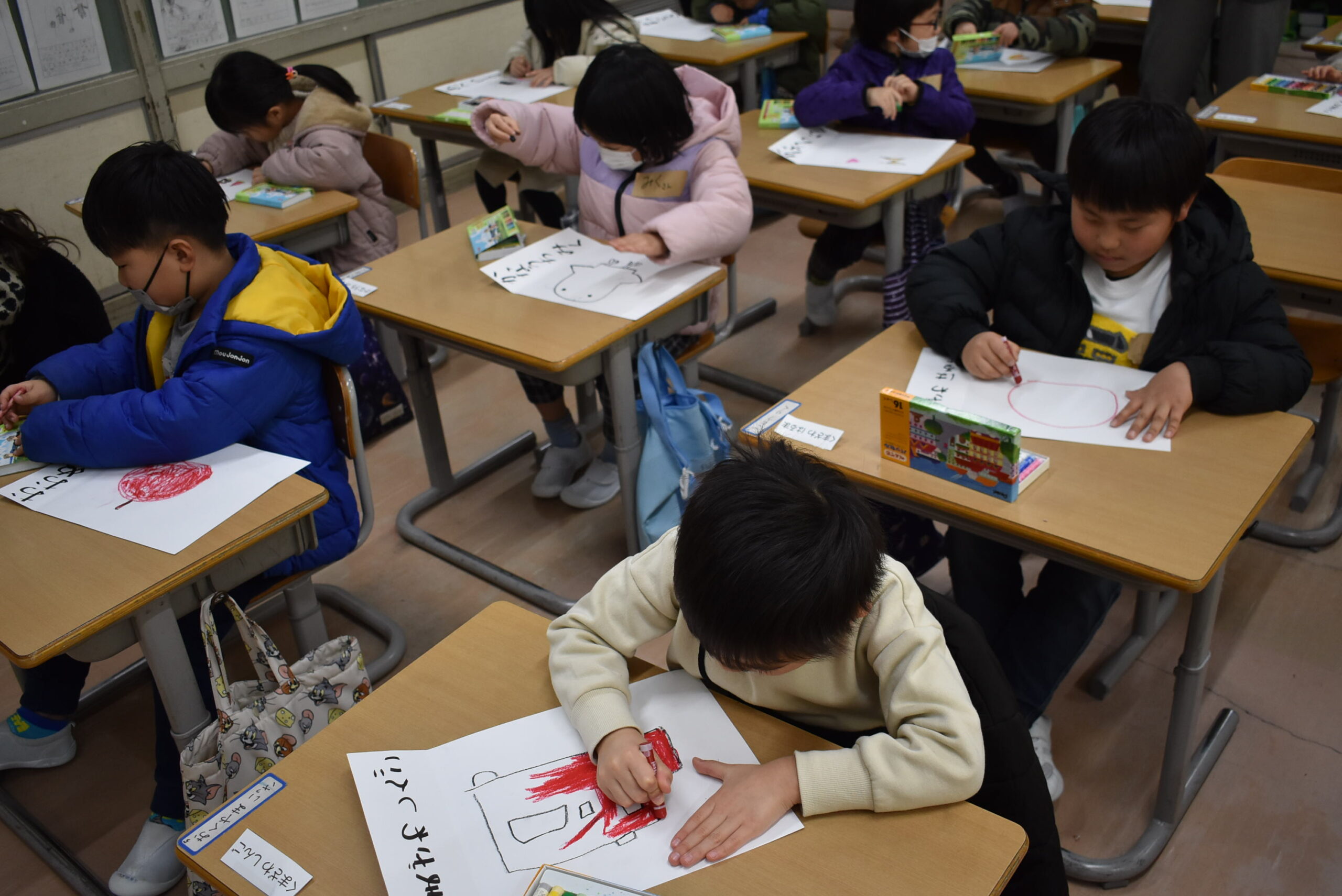 遊んだ後は、1年生の教室に入って「すきなものの絵」をかきました。